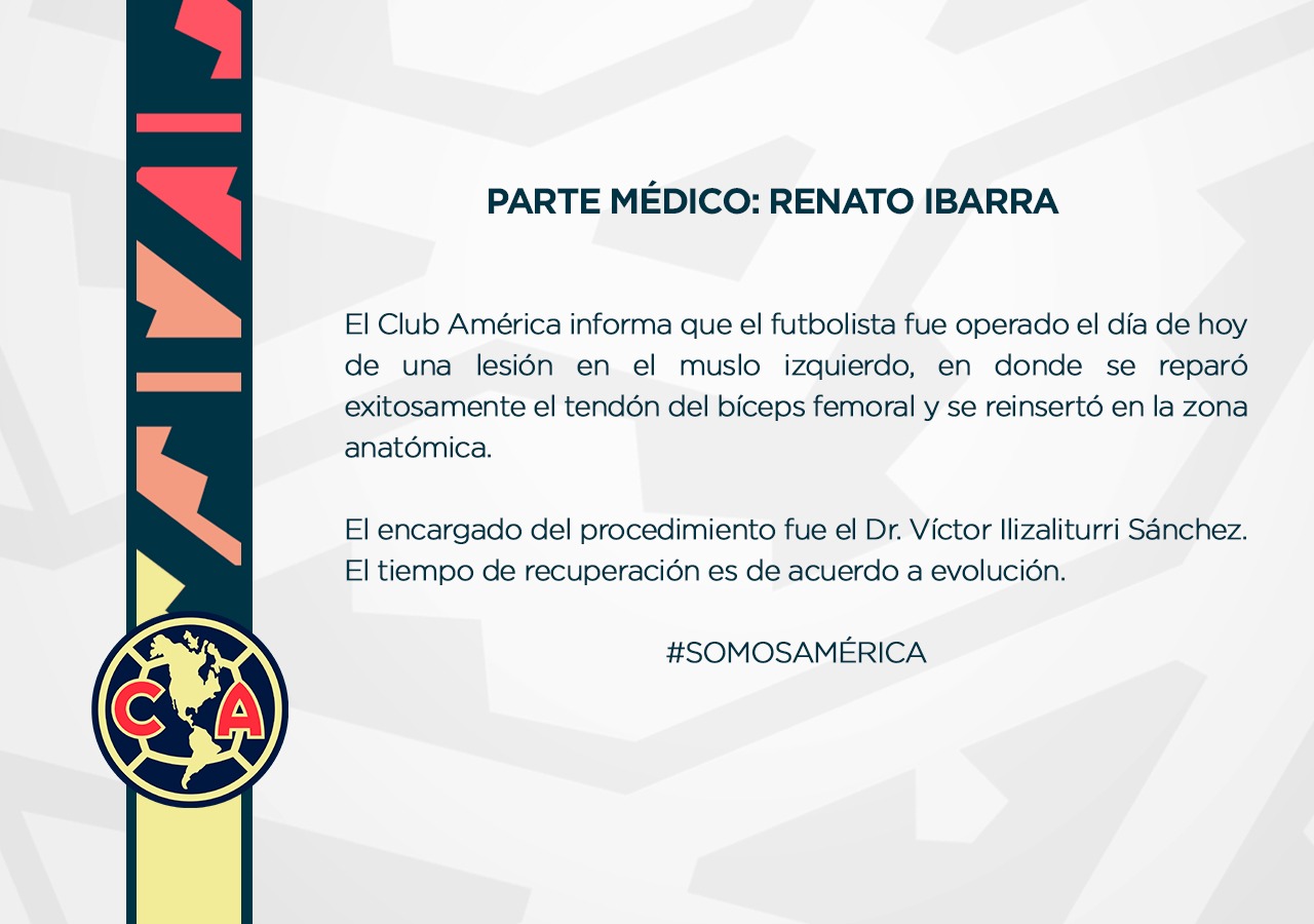 "El Club América informa que el futbolista fue operado el día de hoy de una lesión en el muslo izquierdo, en donde se reparó exitosamente el tendón del bíceps femoral y se reinsertó en la zona anatómica".