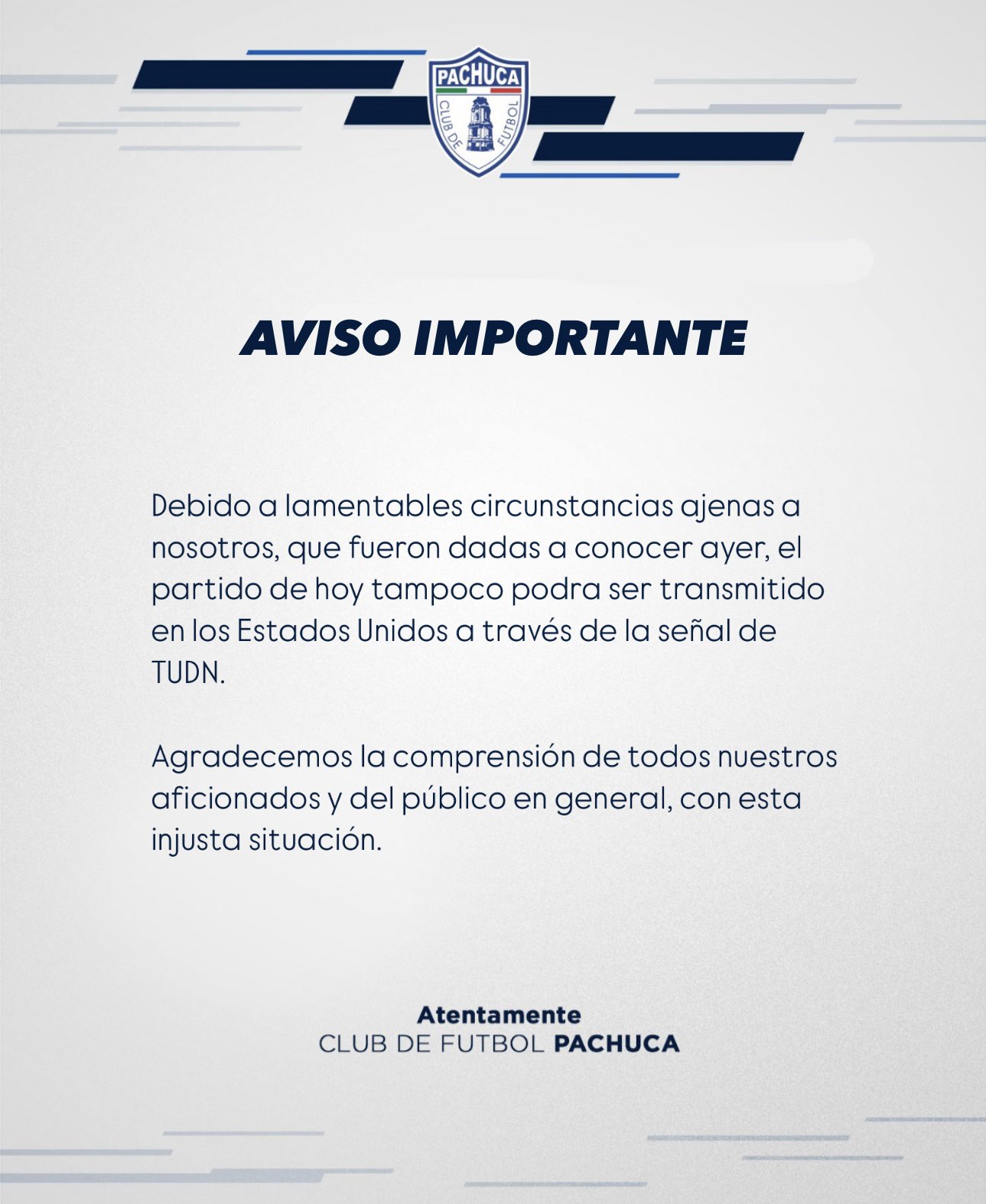 Grupo Pachuca, debido a la disputa que Grupo Lauman tiene con Fox Corporation, anunció que el encuentro ante el América, el cual es correspondiente a la Jornada 14 del Clausura 2025, no tendría transmisión.