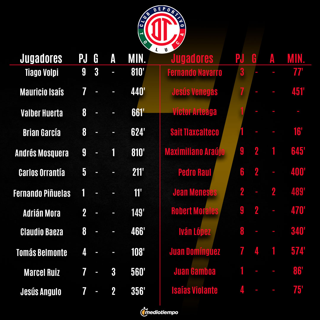 También están las expulsiones que han vivido los Diablos. La última fue la de Tomás Belmonte, que fue echado del encuentro ante América y se perderá el partido contra las Chivas. Previamente, Jean Meneses había visto la tarjeta roja en la Jornada 8; en tanto que Jesús Piñuelas que ingresó de cambio ante Pumas y tras ser expulsado, nunca ha vuelto a tener minutos.