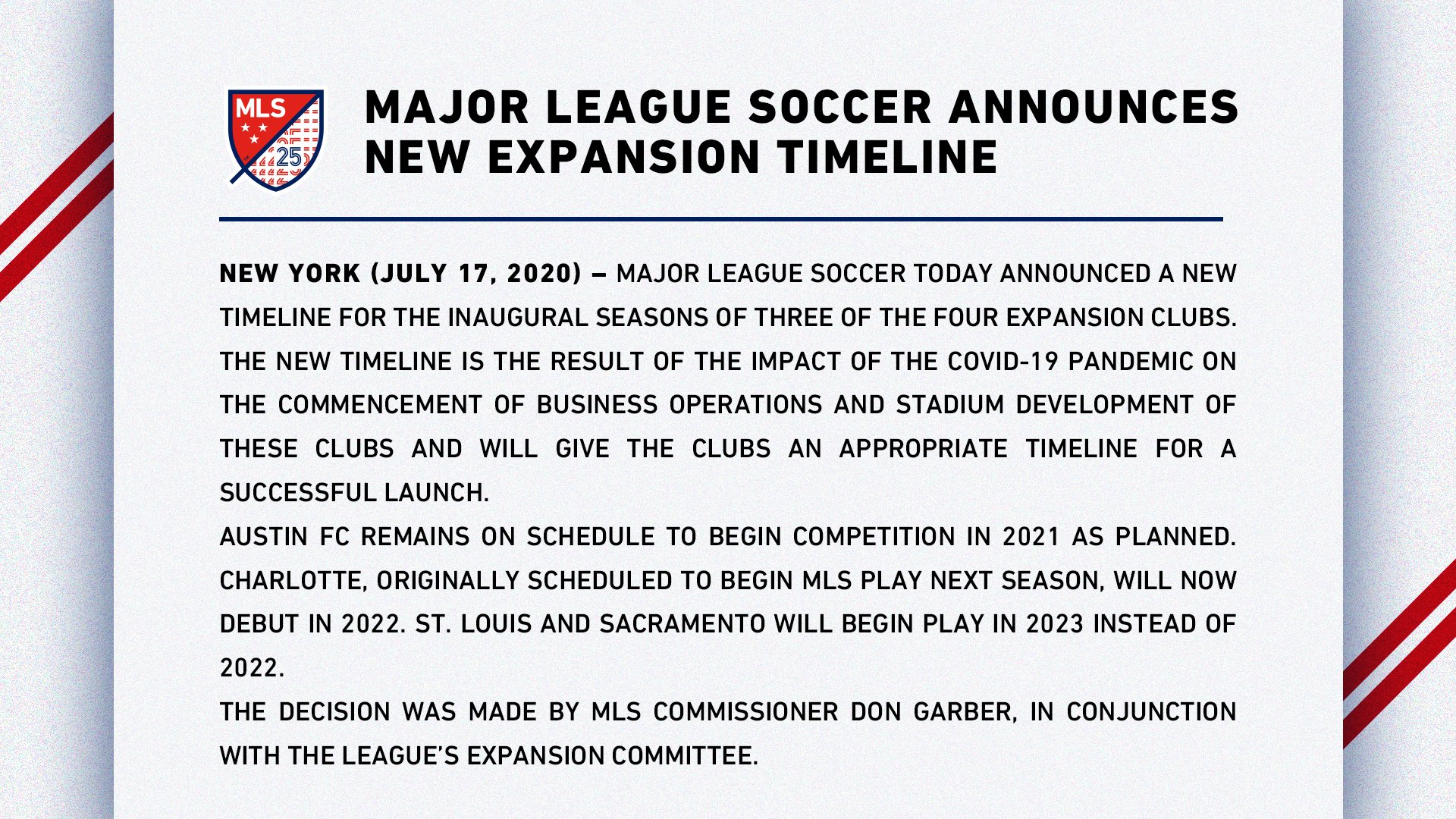 "Es importante que cada club se tome el tiempo necesario para lanzar sus temporadas inaugurales de la MLS de la manera que sus aficionados y comunidades se merecen", dijo el comisionado de la liga, Don Garber. "Con el año adicional para compensar lo que ha sido un 2020 desafiante, estos equipos estarán bien posicionados para sus debuts y para el éxito a largo plazo".