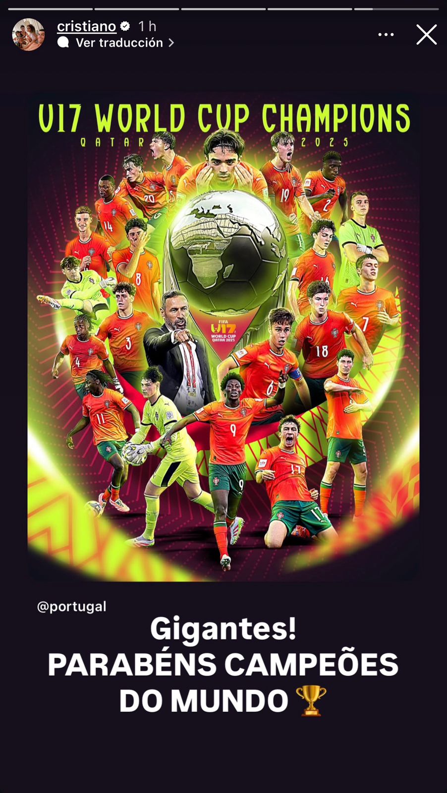 El histórico jugador luso, Cristiano Ronaldo, utilizó su cuenta de Instagram para felicitar a sus jóvenes compatriotas: "¡Gigantes! Felicidades, campeones del mundo", escribió el Bicho en su historia de Instagram este jueves.