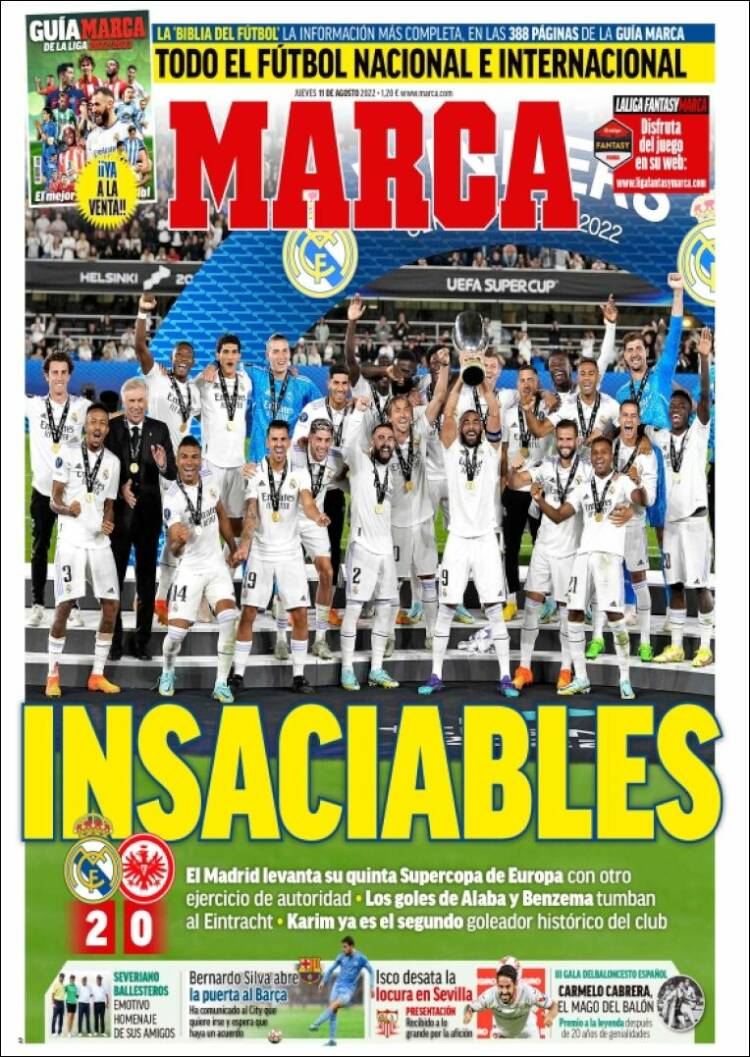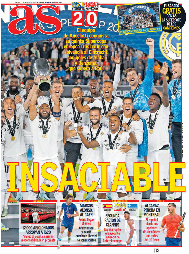 El triunfo del Real Madrid en la Supercopa de Europa ante el Eintracht Frankfurt, le valió a los españoles para acaparar la mayoría de las portadas de algunos diarios en Europa este jueves 11 de agosto. Incluso, ello valió para que tanto Marca como AS repitieran su titular: "Insaciables".