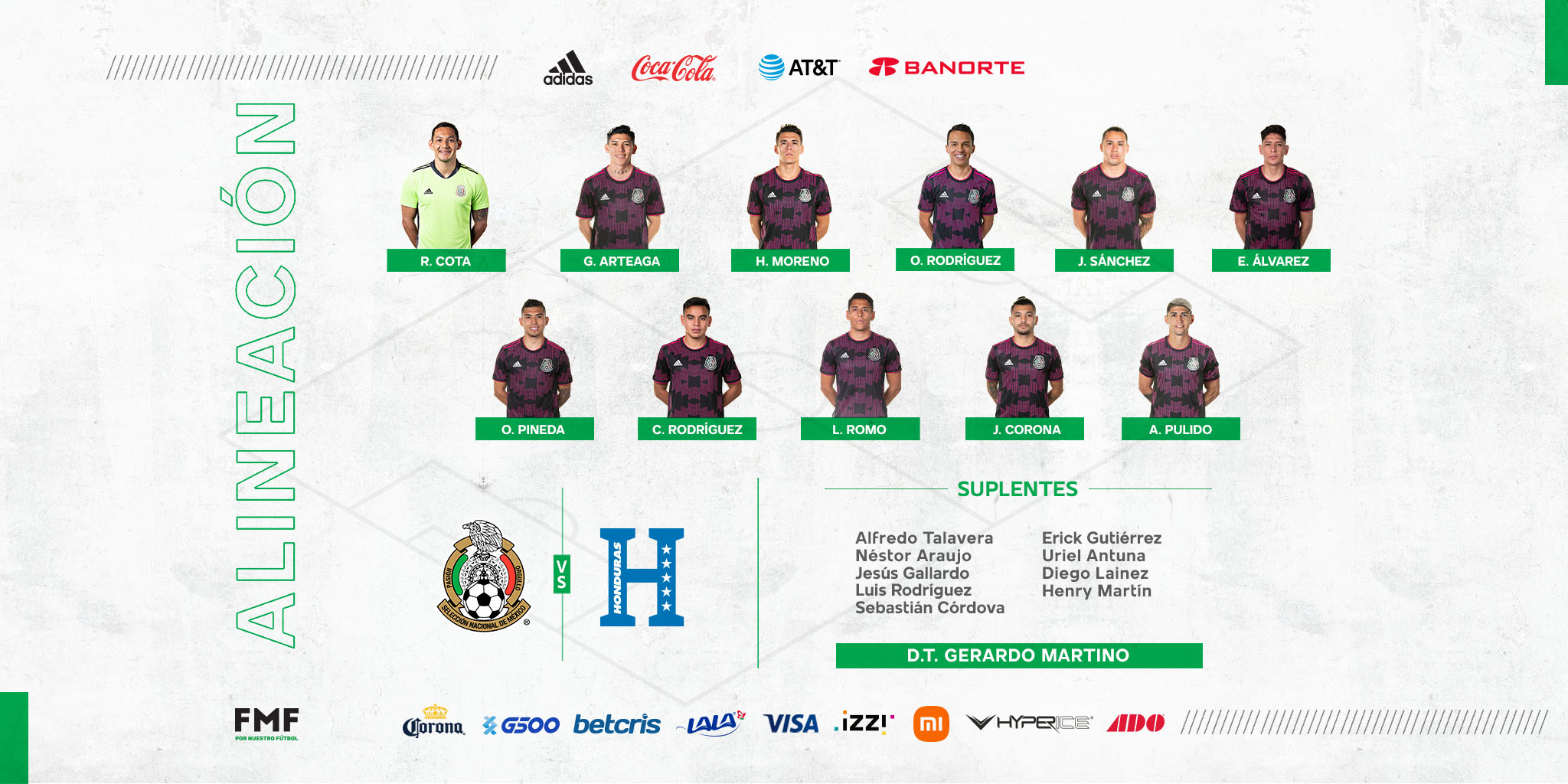 Rodolfo Cota; Osvaldo Rodríguez, Héctor Moreno, Edson Álvarez, Jorge Sánchez; Luis Romo, Carlos Rodríguez, Gerardo Artega, Orbelín Pineda; Jesús Corona y Alan Pulido.