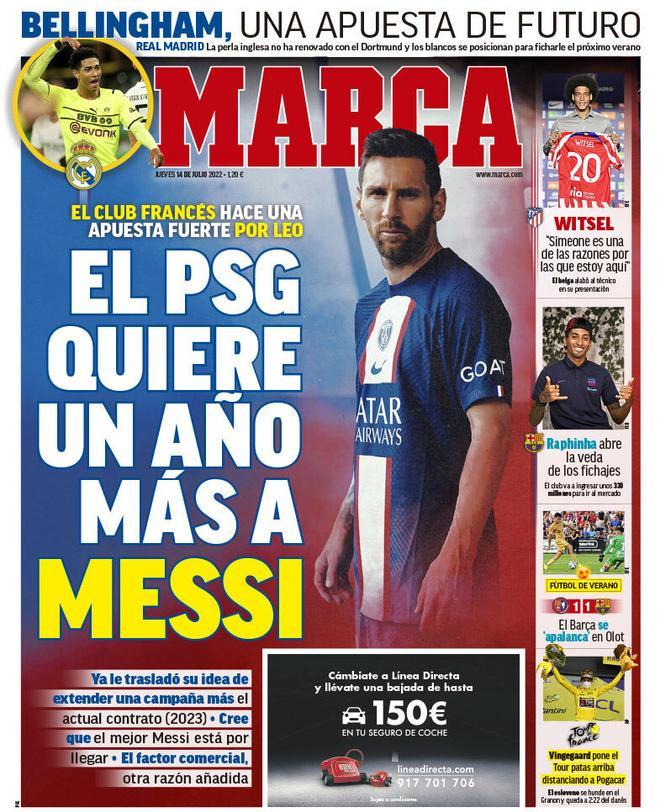 El diario español dedicó su primera plana a la idea que tendría el PSG para extender por un año más el contrato de Messi, el cual firmó con el conjunto francés hasta 2023 tras su salida del Barcelona.