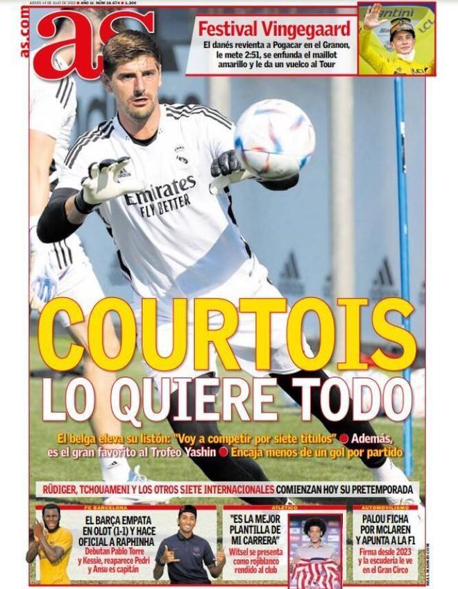 El diario As dedicó su primera plana a unas declaraciones de Thibaut Courtois, portero del Real Madrid, el cual aseguró que va a "competir por siete títulos".