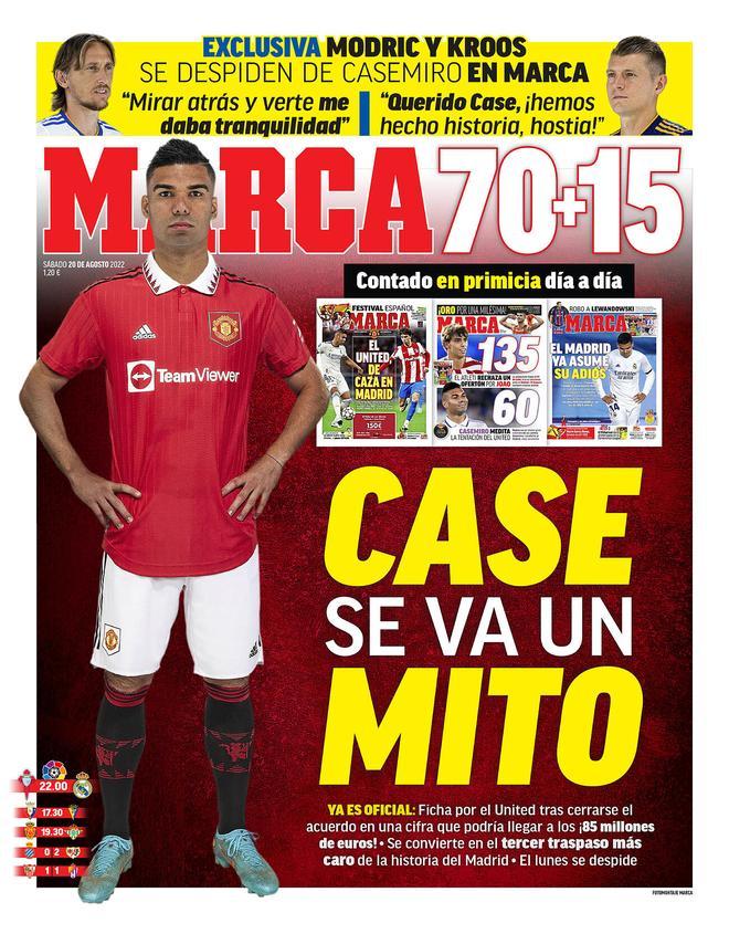 El diario Marca dedicó en su primera plana a Casemiro, quien "ficha por el United tras cerrarse el acuerdo en una cifra que podría llegar a los ¡85 millones de euros!".