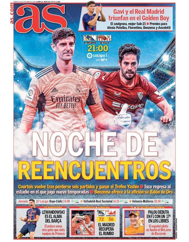El periódico AS publicó en su primera plana la previa del juego entre Real Madrid y Sevilla, encuentro en donde Thibaut Courtois regresará al arco de los merengues e Isco volverá a la cancha del Bernabéu.