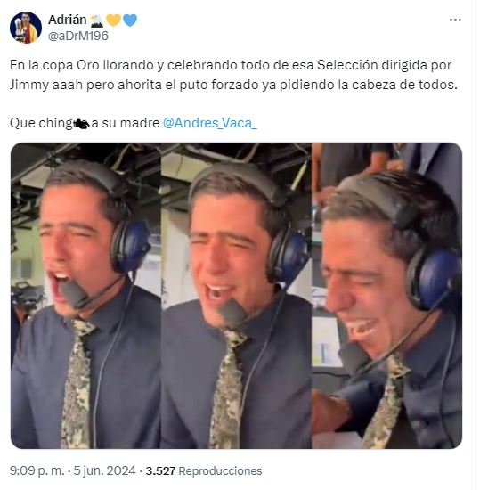 "El wey no tiene credibilidad al llorar con la Copa Oro y esa misma noche cromer* al Jimmy Lozano intentado vendértelo como el nuevo Guardiola"; "No olvidar que este ídolo de pendej*s lloró por un gol en la COPA ORO y ahora se quiere hacer el canchero put*ando a la Selección Mexicana"; "Neta porque lloraste con un gol en copa oro"; "Hay que distinguir entre un narrador y un analista. Andrés Vaca intenta ser lo primero, y no es lo segundo".