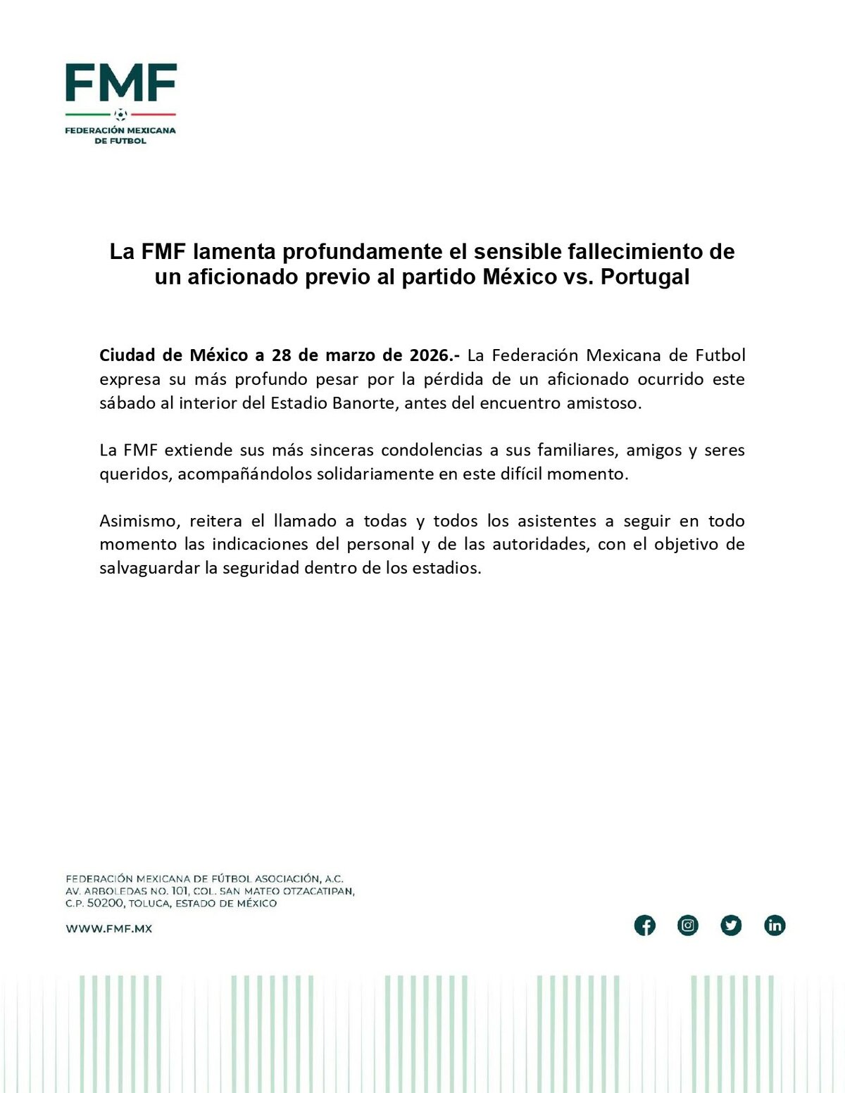 "La Federación Mexicana de Futbol expresa su más profundo pesar por la pérdida de un aficionado ocurrido este sábado al interior del Estadio Banorte, antes del encuentro amistoso", inició el organismo en un comunicado difundido ayer por la noche a través de redes sociales y otros canales de comunicación.