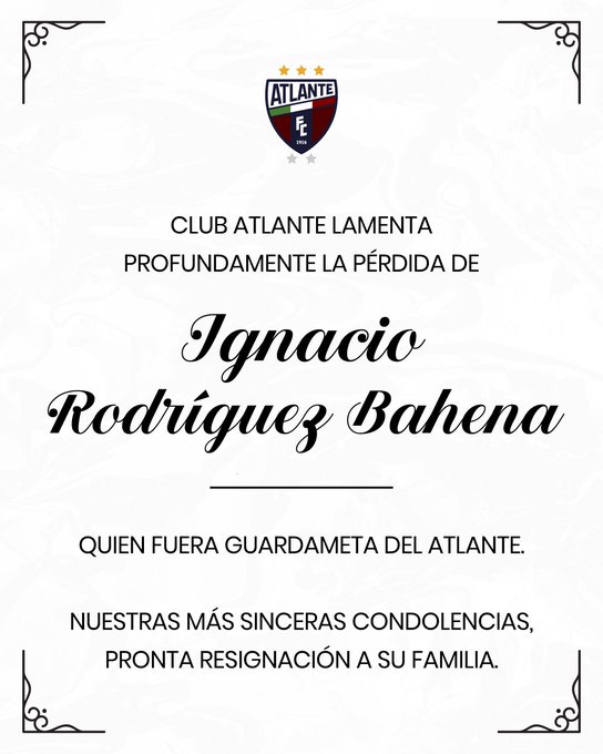"El Club Atlante lamenta el sensible fallecimiento de Ignacio Rodríguez Bahena, quien fuera guardameta de nuestro equipo. Nuestro más sincero pésame a su familia y amigos"