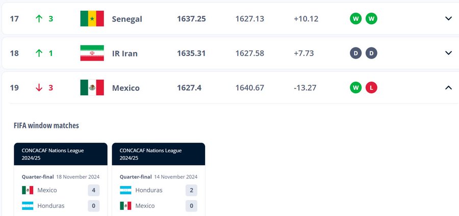 Cabe recordar que el ranking anterior, el cal se publicó a finales del mes de octubre, el conjunto azteca había ocupado el lugar 16, con lo que se colocó como la mejor selección de la Concacaf. Ahora descendió tres lugares tras perder 2-0 ante los catrachos y después ganarle 4-0 en los Cuartos de Final de la Nations League.