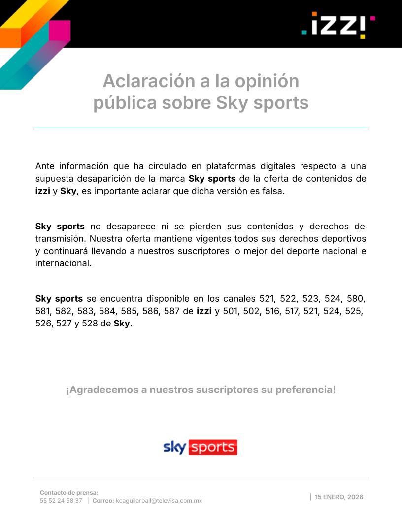 "Ante información que ha circulado en plataformas digitales respecto a una supuesta desaparición de la marca Sky Sports de la oferta de contenidos de izzi y Sky, es importante aclarar que dicha versión es falsa", compartió Izzi mediante sus canales oficiales de comunicación.
