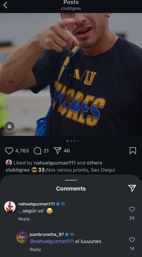 Por ello Nahuel Guzmán se tomó con humor el post del club en Instagram y le respondió ‘según vo’ y un emoji de una cara riéndose, mientras que Juan Brunetta también le puso ‘el luuuunes’.