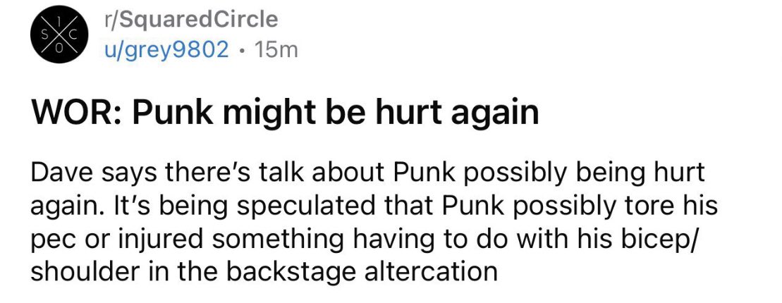 Informa el medio Wrestling Observer que a consecuencia de la campal tras bambalinas en Chicago el domingo, CM Punk se habría lesionado el bíceps y es un tema que hasta podría requerir cirugía, misma que lo dejaría fuera varios meses y le obligaría a -aparentemente- dejar vacante el Campeonato Mundial de AEW, aunque nada de esto ha sido confirmado por la empresa propiedad de Tony Khan.