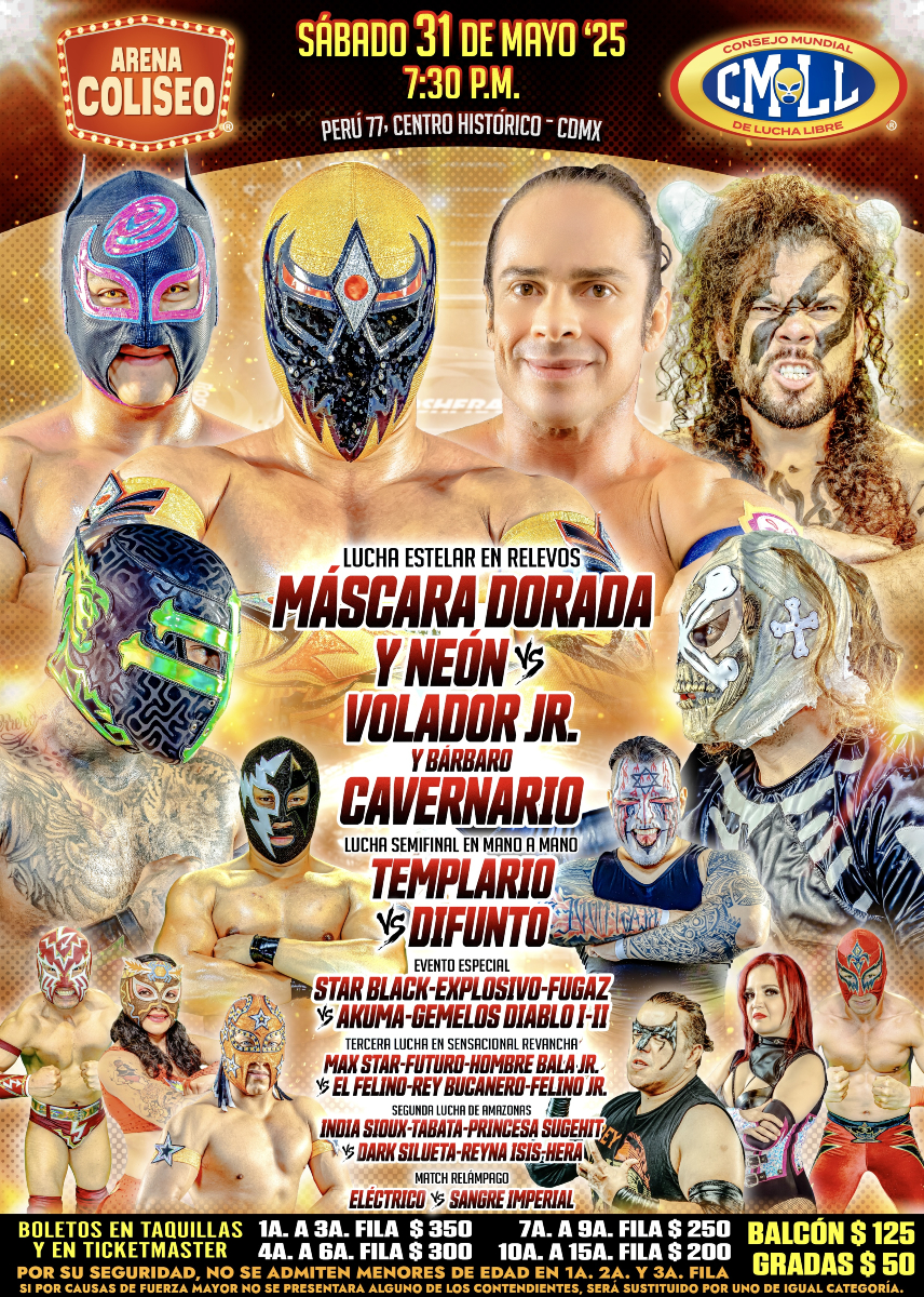 En la contienda estelar de la velada, Máscara Dorada, quien viene de perder la Copa Jr. Vip, unirá fuerzas con Neón para enfrentar a Volador Jr. y Bárbaro Cavernario.