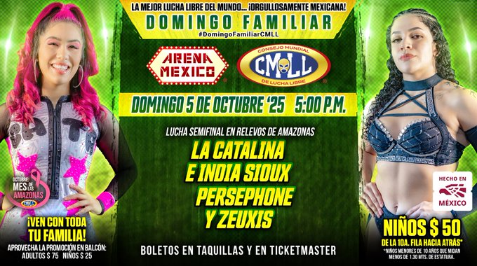 El Consejo Mundial de Lucha Libre (CMLL) se prepara para ofrecer una explosiva función este domingo 5 de octubre de 2025 a las 17:00 horas en la emblemática Arena México, como parte de sus tradicionales funciones familiares.