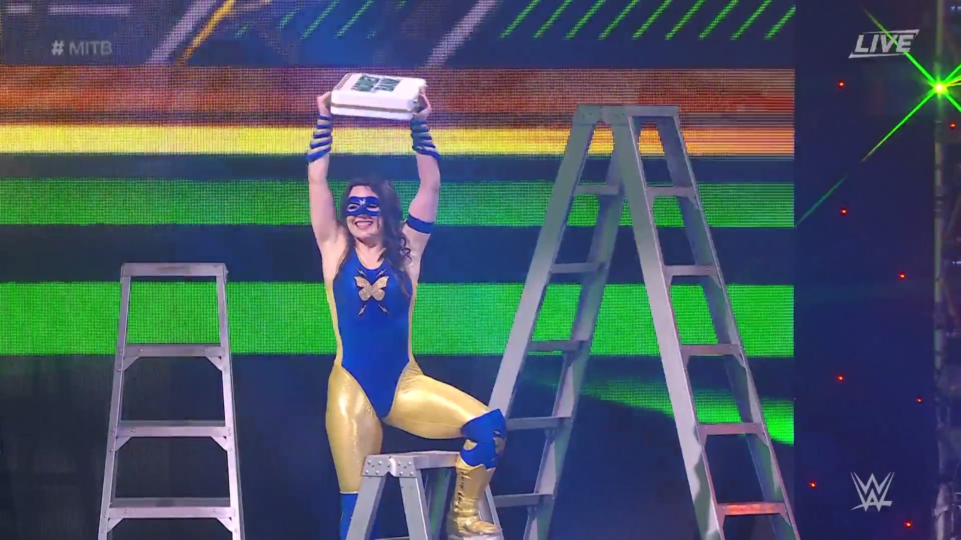 19:31 ¡Nikki Cross es la ganadora del Money in the Bank! La ahora llamada Nikki ASH en su faceta de heroína se vio más lista que el resto de las competidoras que se peleaban sobre tres escaleras por el maletín, ella de la nada se coló entre todas y descolgó el premio.