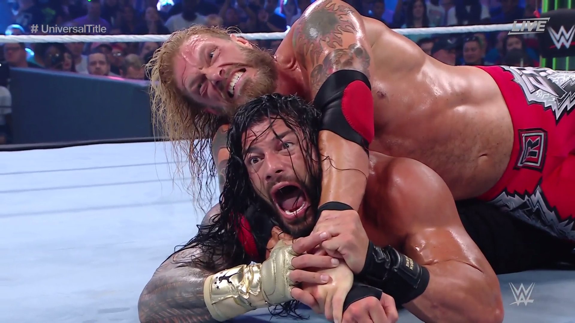 ¡Atrapado en el Crossface! La llave de rendición de Edge que tantos sustos le ha sacado a Roman es aplicada, pero el campeón logra romperla tocando la primera cuerda.