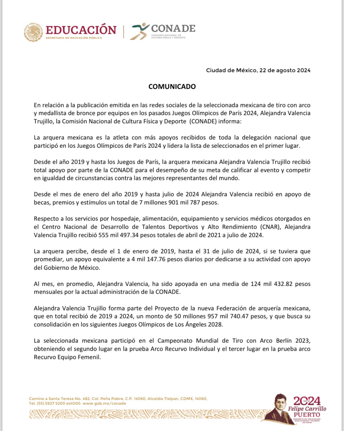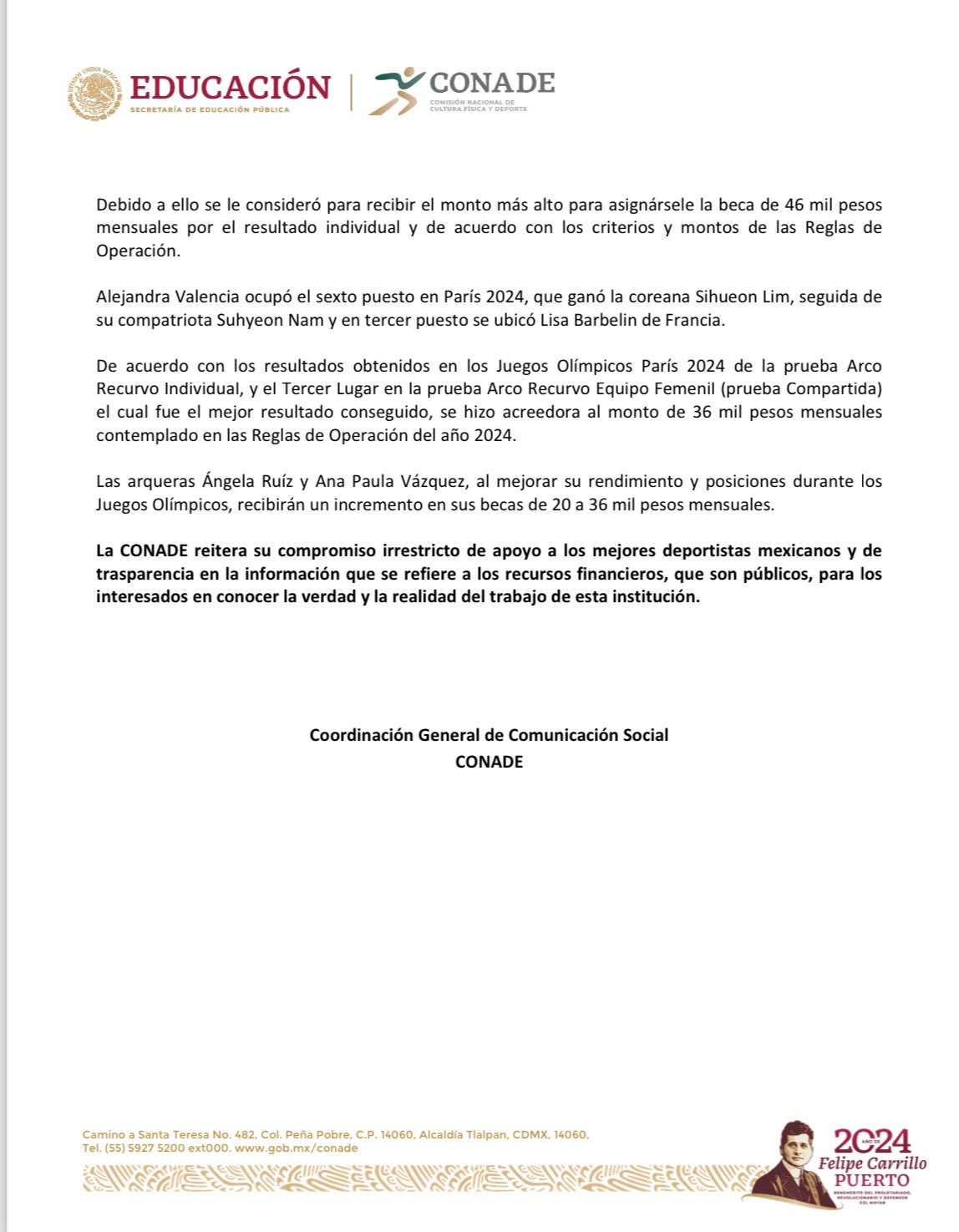 La Comisión Nacional de Cultura Física y Deporte (CONADE) le respondió a Alejandra Valencia, quien acusó al organismo de reducirle su beca tras la medalla de bronce que ganó en los Juegos Olímpicos París 2024.