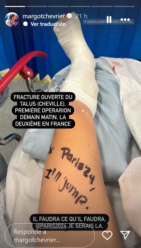 Tras lo sucedido, Margot Chevrier usó sus redes sociales para publicar una imagen de su tobillo con un yeso, posteo en el que se mostró muy optimista, pues aseguró que pese a la gravedad de la lesión luchará para poder estar en los Juegos Olímpicos de París 2024.