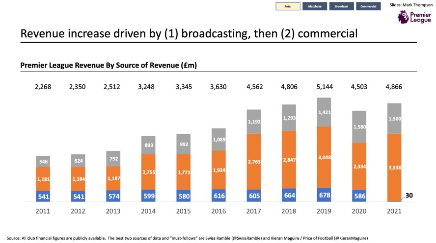 Para entrar un poco en los datos de negocio que han hecho que la Premier League esté en el nivel que está, hubo un corte a 2021, si, justo en plena pandemia donde, como toda liga tuvo una sacudida pero logró salir avante por el nivel de negocio que ya la precedía.