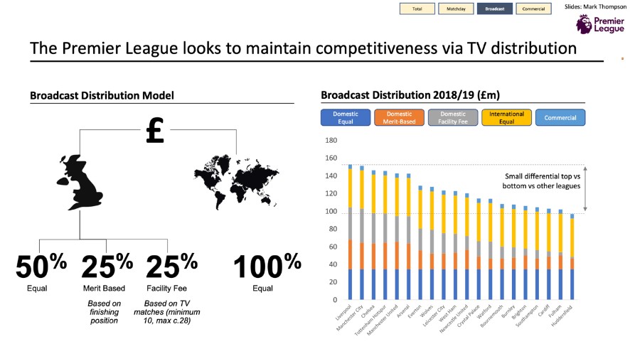 En el tema derechos de transmisión, la Premier League se transmite en más de 200 países a nivel mundial, impactando a más de 900 millones de hogares alrededor del mundo, con un promedio de más de 1,500 millones de personas sintonizando cada semana de la temporada. Lo que representa un ingreso aproximado de ingresos de más de € 3,800 MDE tan solo por los derechos.