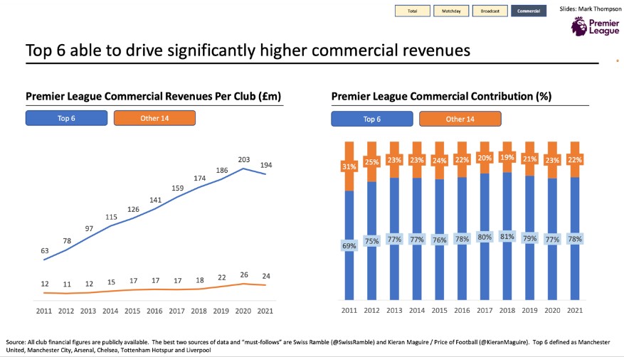 Para 2021, el ingreso comercial fue significativo dando mayor impulso e ingreso al top 6 de clubes de la Premier, y a los 14 restantes un promedio equitativo.