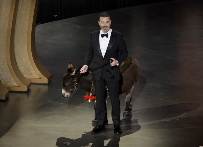 Jimmy Kimmel llegó acompañado por un burrito, que de acuerdo al presentador, se trata de Jenny, de la cinta 'The Banshees of Inisherin'