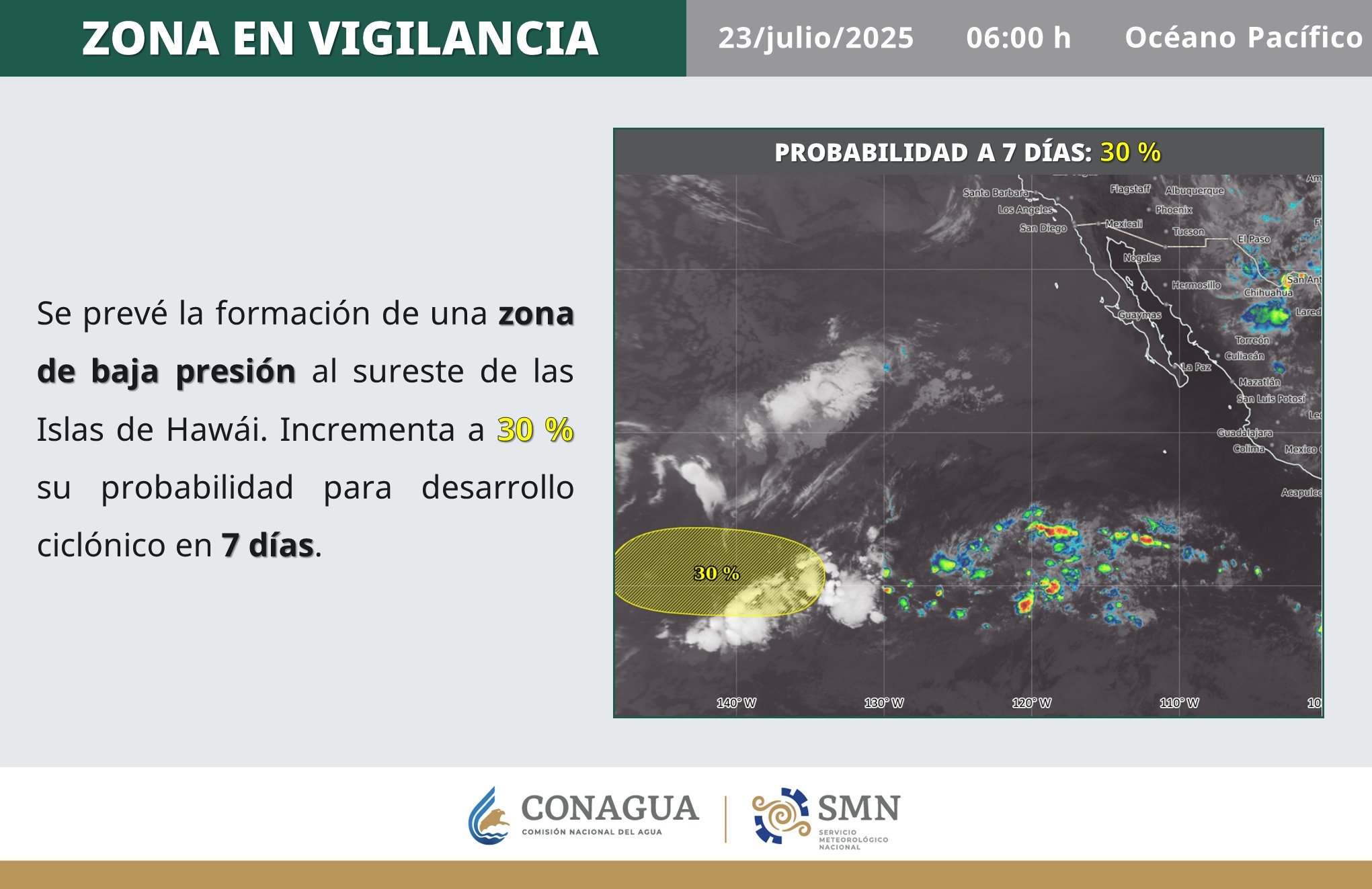 La segunda zona de vigilancia se encuentra algo lejos del territorio nacional. Se prevé la formación de una zona de baja presión al sureste de las Islas Hawái. Tiene una probabilidad de incrementar del 30% en los próximos 7 días.