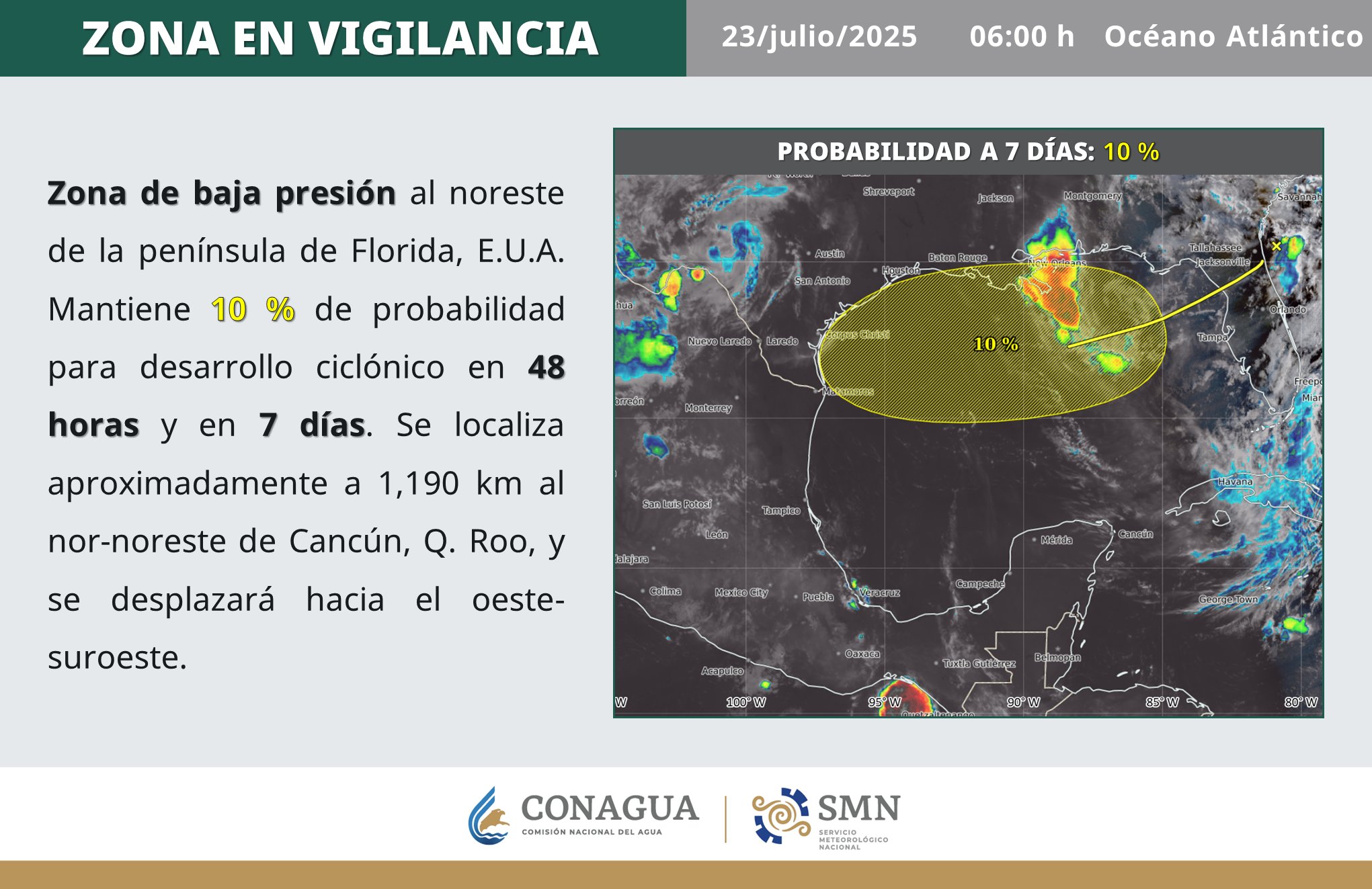 La primera zona de baja presión se encuentra en el Océano Atlántico al noreste de la península de Florida, Estados Unidos y este mantiene un 10% de probabilidad para desarrollo ciclónico en 48 horas y en 7 días.