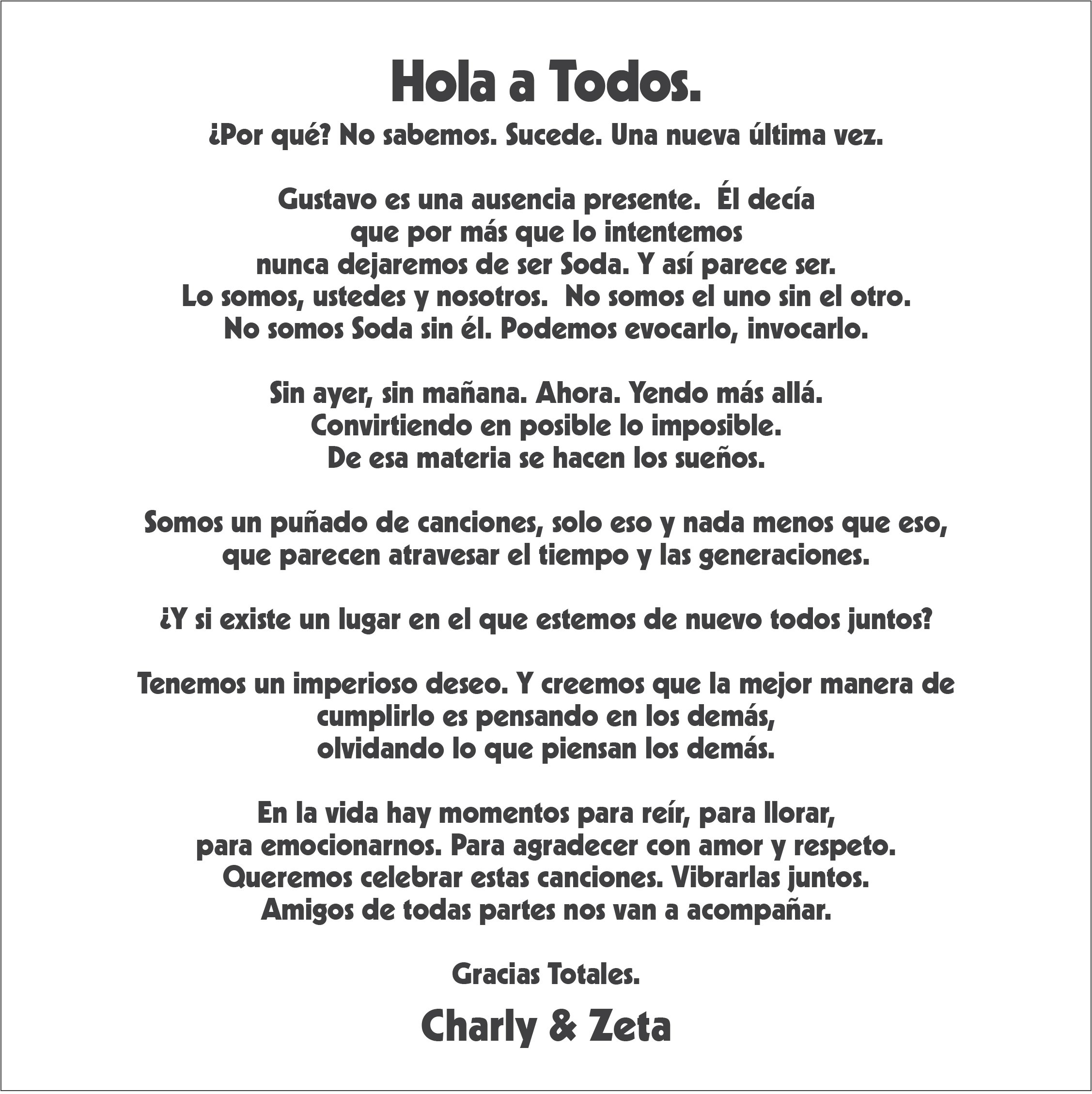 "Hola a Todos. ¿Por qué? No sabemos. Sucede. Una nueva última vez. Gustavo es una ausencia presente. Él decía que por más que lo intentemos nunca dejaremos de ser Soda. Y así parece ser", anunciaron los integrantes de la banda argentina a través de sus redes sociales.