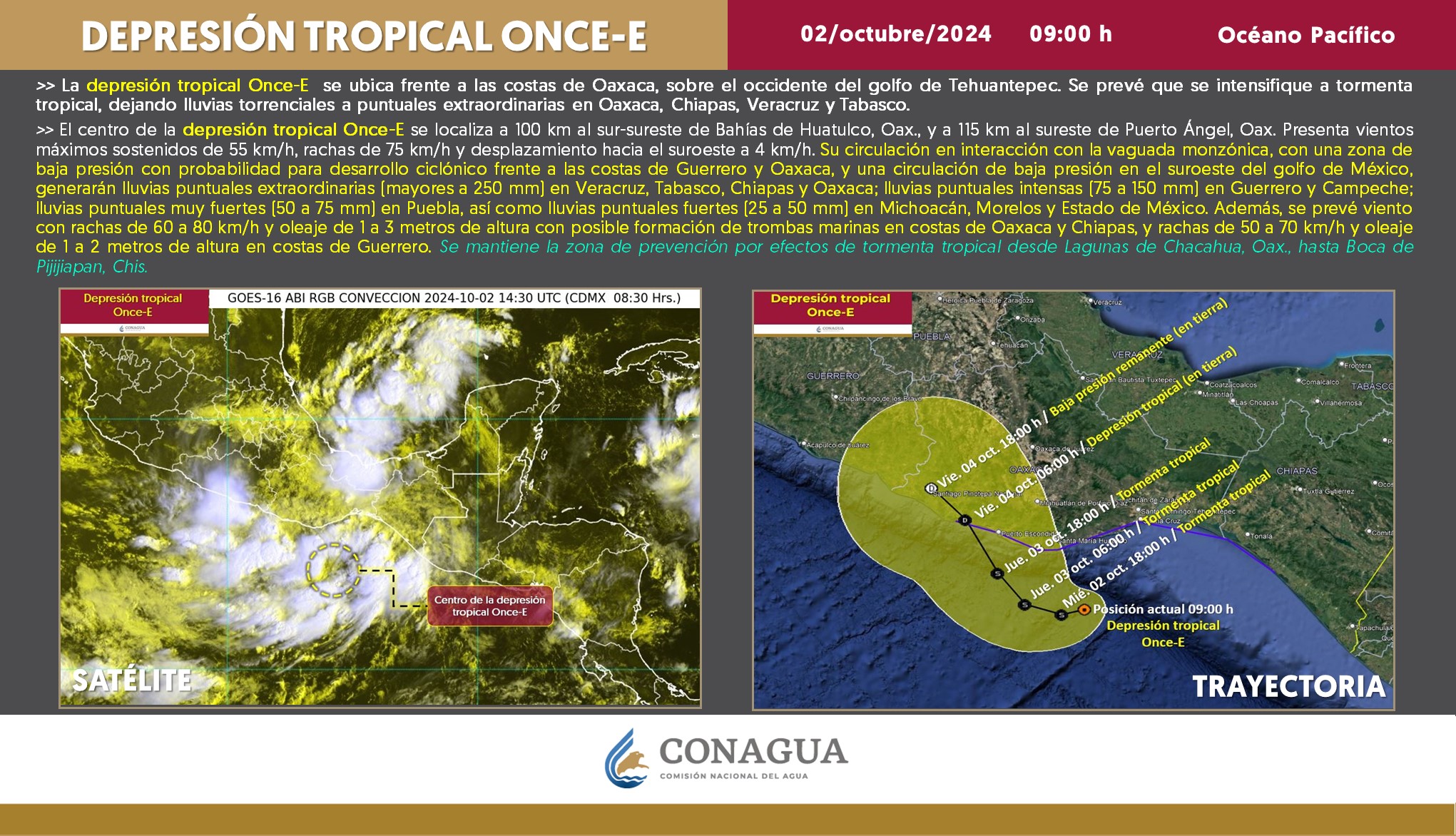 De acuerdo con el Servicio Meteorológico Nacional (SMN) y la Comisión Nacional del Agua (CONAGUA) la depresión tropical Once-E podría intensificarse a tormenta tropical, lo que podría ocasionar lluvias torrenciales a puntuales extraordinarias en los estados de Oaxaca, Chiapas, Veracruz y Tabasco.