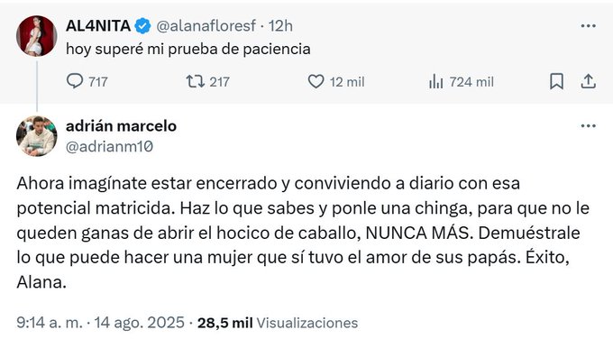 "Haz lo que sabes y ponle una chinga, para que no le queden ganas de abrir el hocico de caballo, NUNCA MÁS. Demuéstrale lo que puede hacer una mujer que sí tuvo el amor de sus papás. Éxito, Alana".