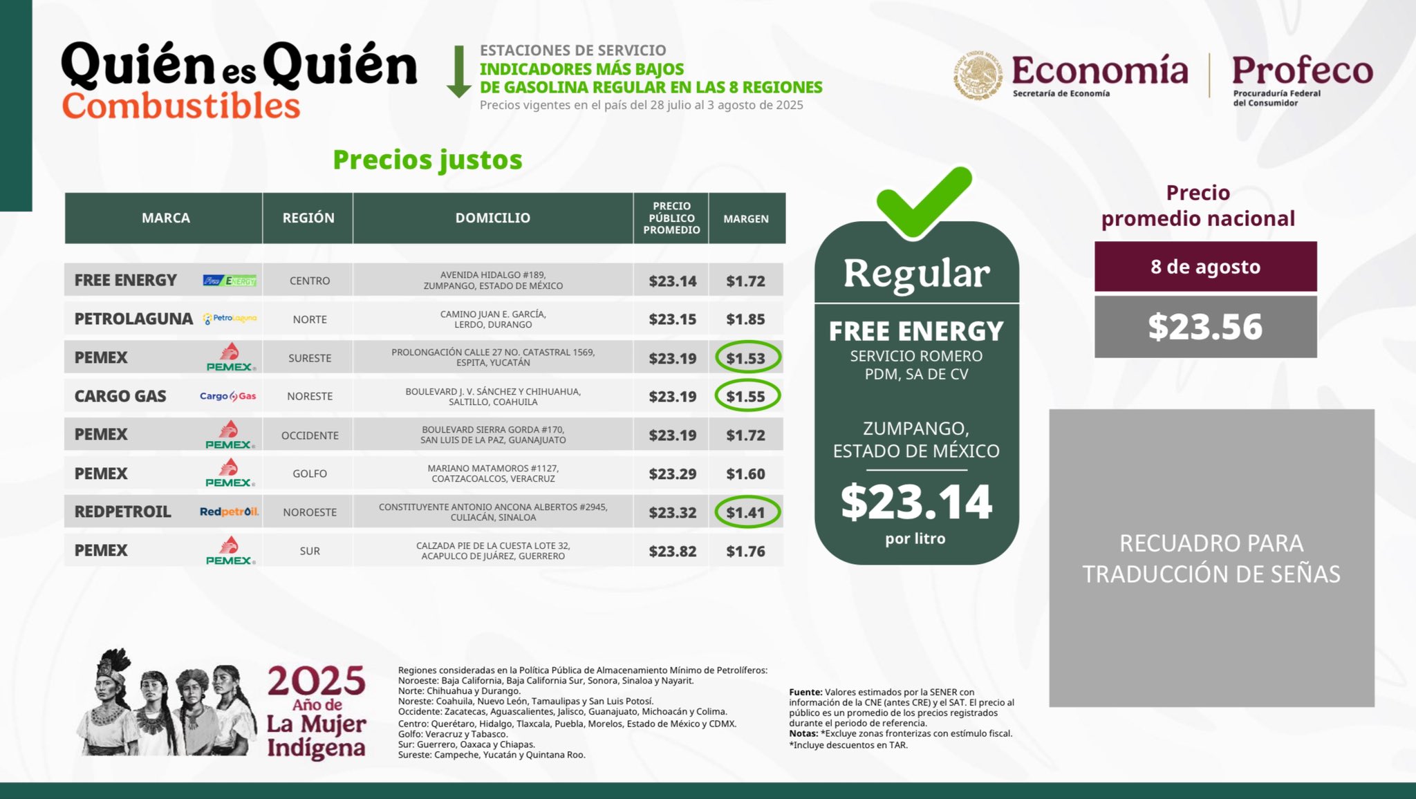 En el mismo comunicado, la Profeco detalla que el precio promedio a nivel nacional, con corte el 8 de agosto, es de 23.56 pesos, destacando algunos de los puntos de venta con menor costo, como lo es la estación Free Energy ubicada en Avenida Hidalgo, Zumpango, Estado de México, con un costo promedio de 23.14 pesos. Aquí el listado completo: