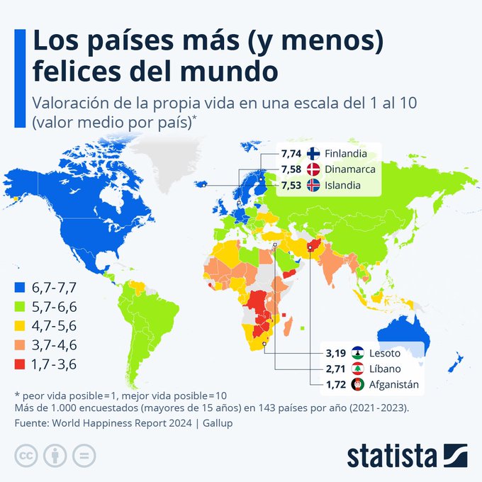 Conforme a ese listado, que es resultado de evaluaciones de vida autoevaluadas promediadas durante los años 2021-2023, los 10 países más felices del mundo son los siguientes: