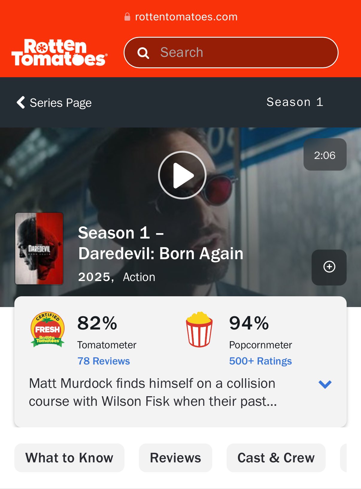 De acuerdo con el portal de Rotten Tomatoes, la primera temporada de 'Dredevil: Born Again' está certificada con una puntuación de 82% de aprobación por parte de las audiencias.