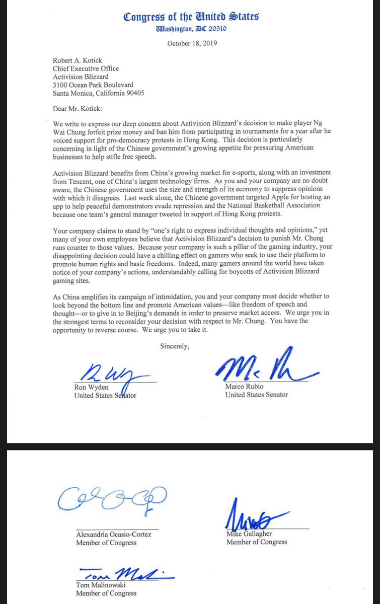 El Congreso de Estados Unidos envió una carta dirigida a Robert A. Kotick, CEO de Activision Blizzard, en el que mostró su descontento por la decisión de expulsar a Ng “Blitzchung” Wai Chung de las competiciones de Hearthstone, además de despojarle su premio obtenido en la Hearthstone Grandmasters Asia-Pacific. La suspensión de Blitzchung sucedió después de que este jugador mostrara su apoyo a Hong Kong durante la transmisión del evento.